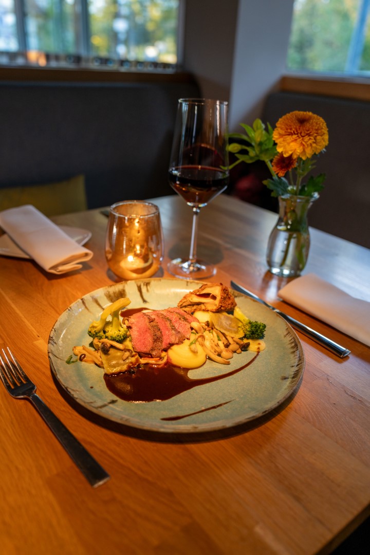 Dazu serviert er kleine Buchenpilze aus unseren Wäldern und zartes, rosa gebratenes Hirschhüftsteak aus der Region. Ihr könnt Euch bei dem Anblick des Tellers sicher vorstellen, wie fantastisch es geschmeckt hat.