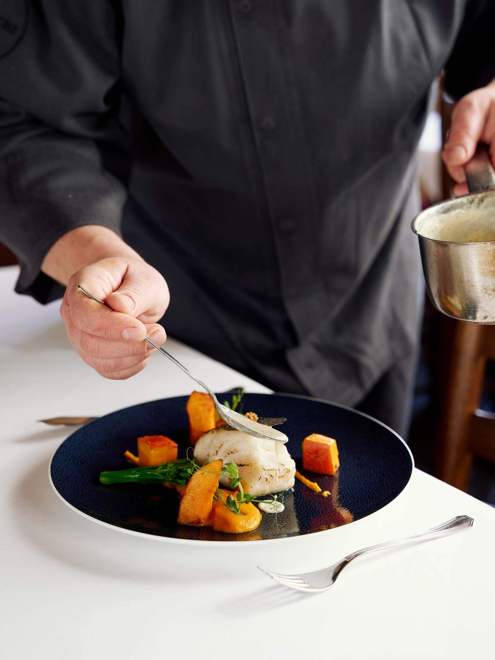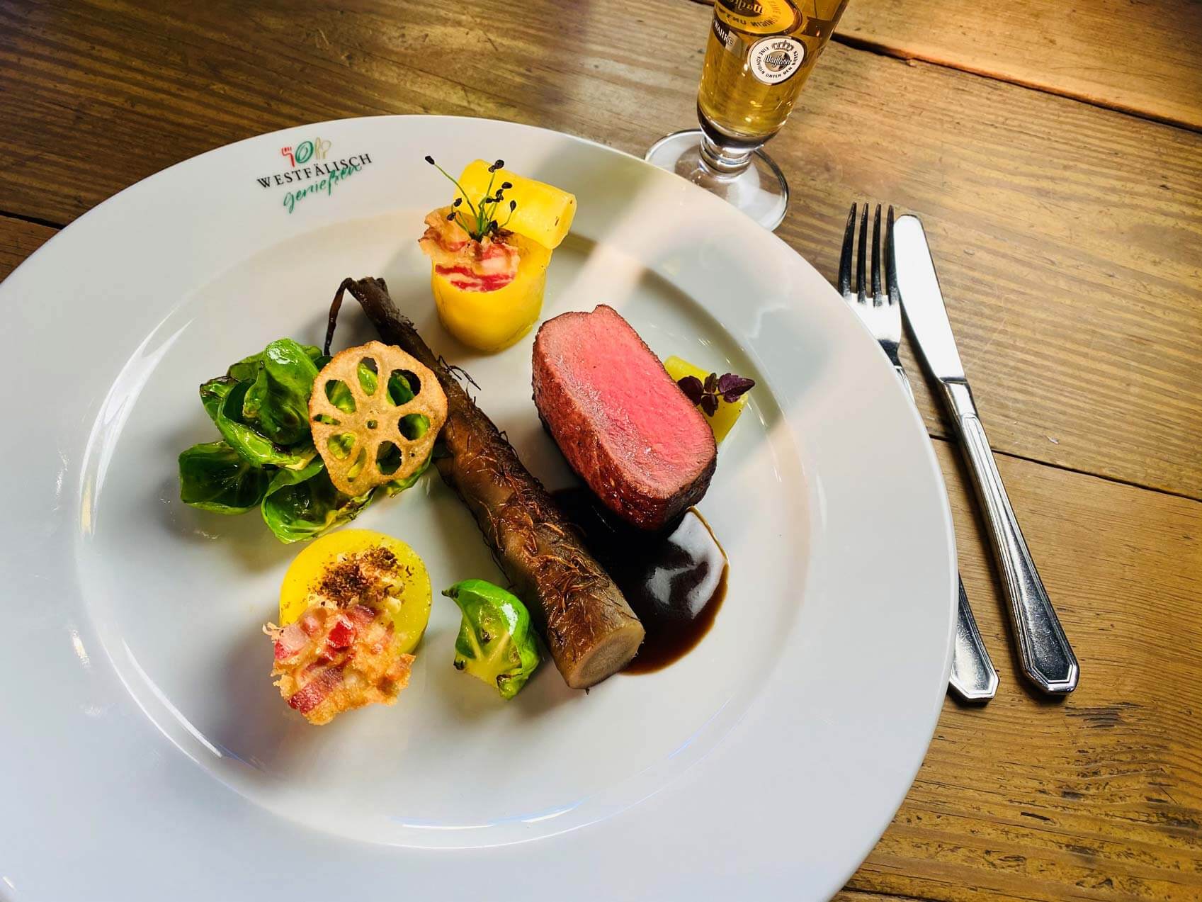 Historisches Gasthaus Buschkamp im Museumshof Senne – Westfälische Gastlichkeit lädt zum Verweilen ein. Nur zu gut können wir uns vorstellen, wie sich Reisende und Wanderer damals auf den Weg gemacht haben, um bei Pickert und Wildbraten im Buschkamp zu verweilen. Und da Gutes ja bekanntlich ewig währt, steht das zum „westfälischen Restaurant des Jahres 1998“ ernannte Gasthaus mit seiner 170-jährigen Gastronomietradition bis heute für westfälische Gastlichkeit. Das Fachwerkhaus erzählt von Geschichte, während Silvio Eberlein seine Kochkunst mit Leidenschaft zelebriert. Ein wahrer Künstler am Herd, der uns mit westfälischer Authentizität, kreativer Finesse und regionaler Verbundenheit begeistert. Wir überzeugen uns selbst und wählen zur Vorspeise eine Suppe aus Eberleins Kräutergarten mit Kabeljau und eine gebeizte Rinderhüfte vom US-Beef mit Glasnudelsalat, Arganöl, Wasabi-Rucola, Gemüse und Schalotten-Balsamico-Kaviar. Zum Hauptgang lassen wir uns die vegetarische Kreation »Gemüseacker – Oben & Unten- «, sowie einen Rehrücken aus heimischer Jagd mit Kirsch-Essig-Jus, Pfifferlinge, Sellerie und Kartoffel-Terrine mit Sommertrüffel schmecken. Wir schweben im siebten Genusshimmel und es wundert uns nicht, dass »Der Feinschmecker« Silvio´s Kochkünste mit den Worten lobte »…im Museum, aber nicht von gestern…«