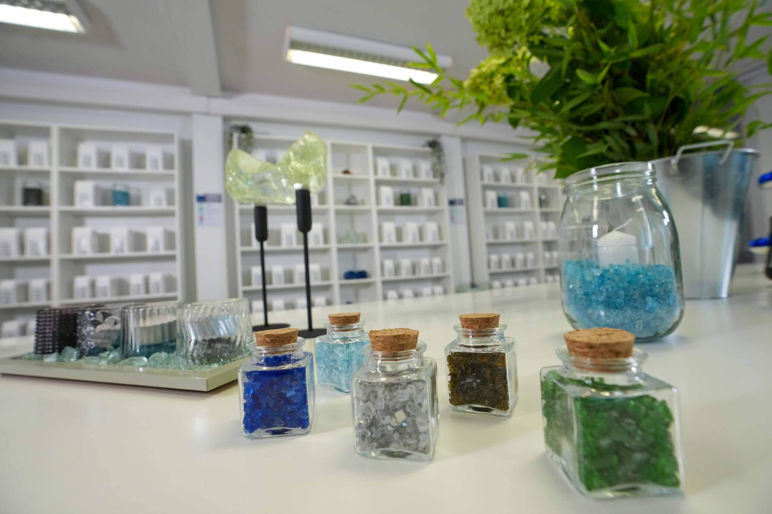 Im neuen Ladengeschäft »Revitro Showroom & Verkauf«, der Anfang September eröffnet wurde, kann man sich anschauen, was man mit dem Glaskies oder den Glasbrocken von REVITRO verschönern kann. Die Farben spielen hier eine wesentliche Rolle. Voraussetzung für die intensiv leuchtenden bis sachlich kühlen Farben des Endproduktes ist die hohe Farbreinheit des Eingangsmaterials. Im Vorfeld ist also das sortenreine Sammeln von Altglas wichtig für ein einwandfreies Endprodukt.