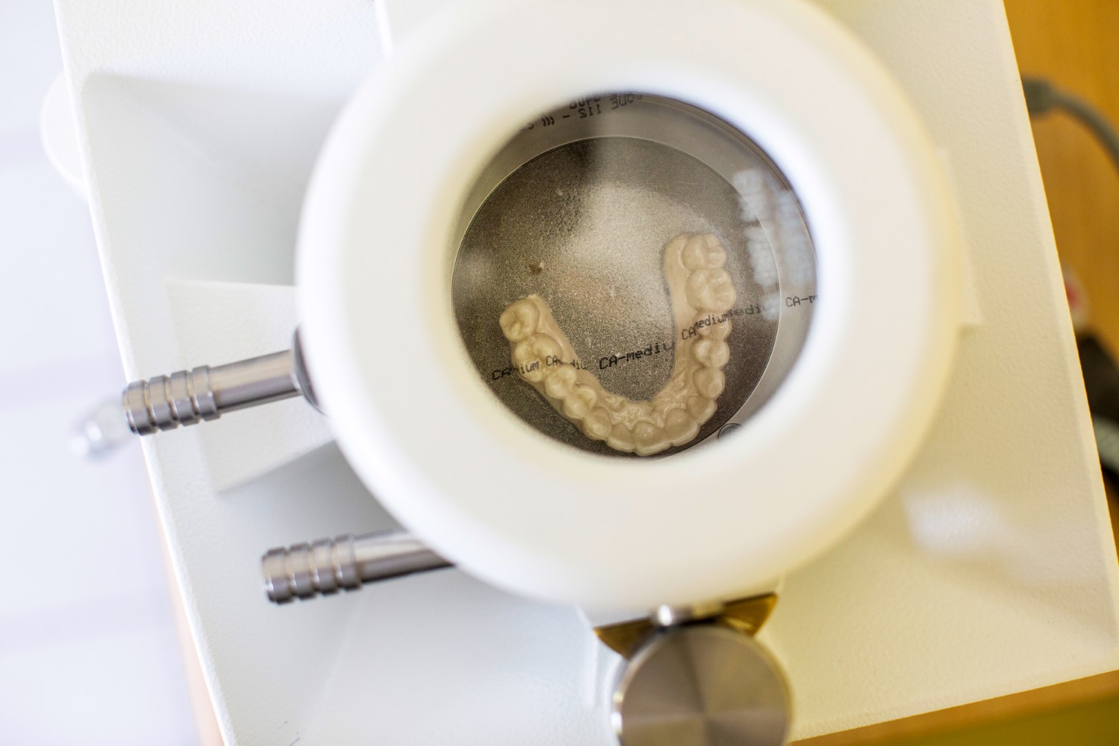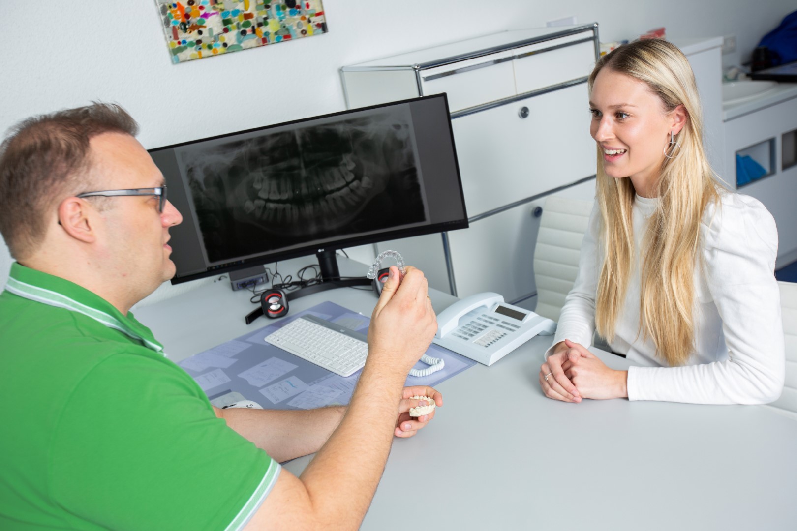 Die beiden haben sich nach einer intensiven und kompetenten Beratung, für eine zeit- und kosteneffiziente Behandlung mit »R-Lignes« Zahnschienen entschieden. Das sind transparente Zahnschienen aus Kunststoff, die lose auf den Zähnen getragen werden. Dabei war es ihnen allerdings wichtig, dass alles aus einer Hand und »Made in Gütersloh« ist.