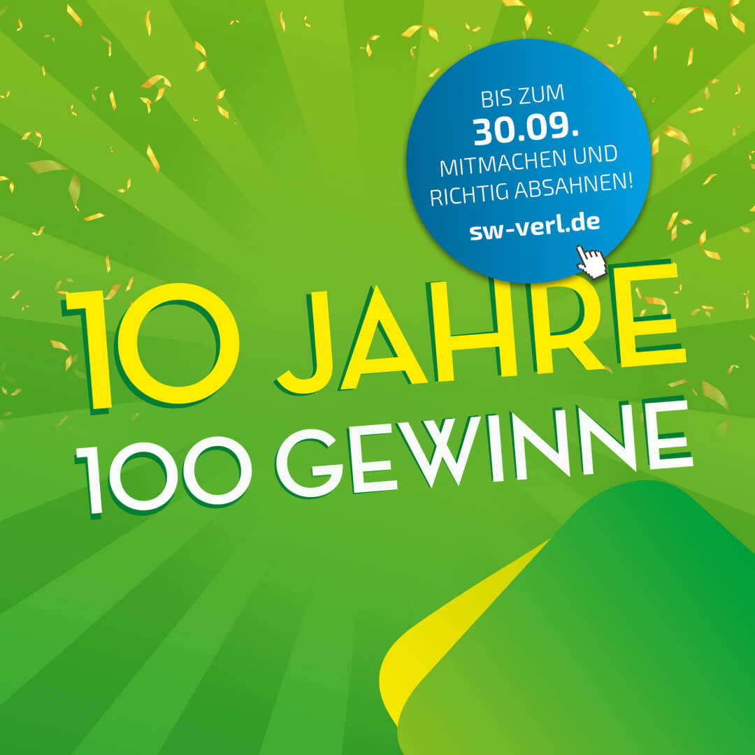 10 Jahre Stadtwerk Verl – und darauf kann man verdammt stolz sein! Das soll gefeiert werden! Dieses besondere Jubiläum wird zum Anlass genommen, Danke zu sagen: Bis zum 30.09. kann man an einem tollen Gewinnspiel teilnehmen und großartige Preise gewinnen. Einfach mal anschauen und mitmachen, es lohnt sich!